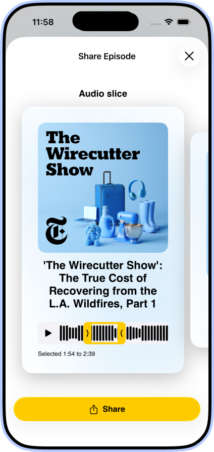 Select an audio slice and share it with your friends. Or just share the link of the episode or podcast.